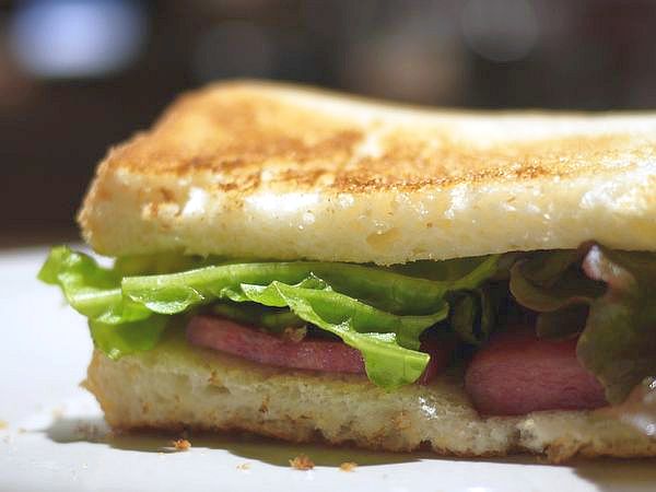 四角いランチョンミート状のソーセージの厚さのそろった二枚をのっけて、サニーレタスと茸を挟む。