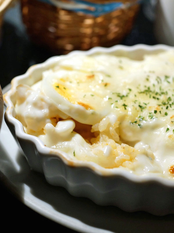 トマト風味の炊き込みピラフ。トマトの酸味とガーリック、塩がパキッときいていてそれだけ食べるといささか濃い味。ところが上にトロンとかかったベシャメルソースがミルクの風味濃厚なれど、塩は薄味。だから一緒に食べるとちょうど良い。