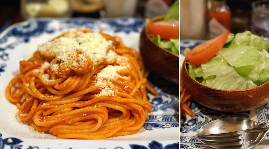 これもいつものランチのプレート。ナポリタンにサラダがのっかる。