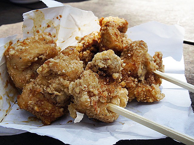 それを串に刺して歩きながらでも食べられるよう…、って工夫をくわえたたのしい料理。