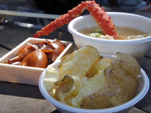 気をひかれるモノをとりあえず集めてみたら、カニの味噌汁、じゃがバターとまるでピクニックの料理のようで、今日のようなアウトドアにはピタッとハマる。
