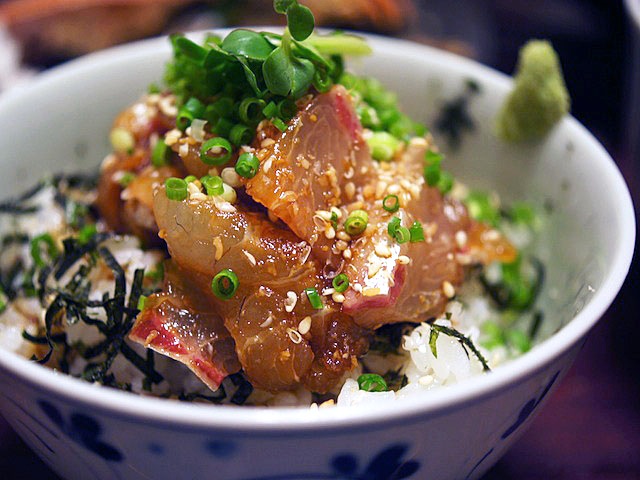 ぶりの切り身を出汁醤油に漬け、それをご飯にタップリのっける。