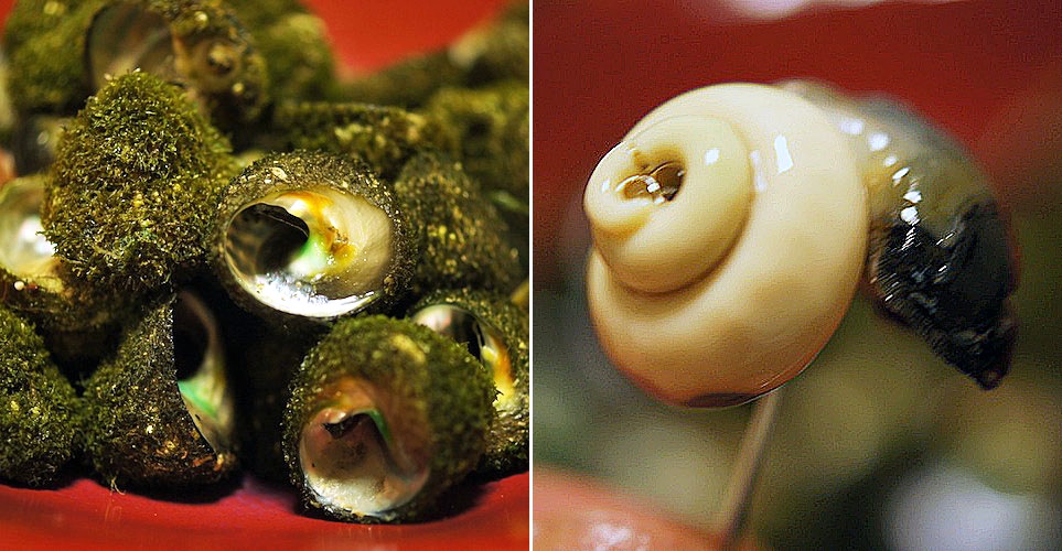 円盤状にとぐろを巻いた巻貝で、表面にコケがビッシリ…、ついさっきまで岩場に必死に張り付いていたに違いないって思ってニッコリ。