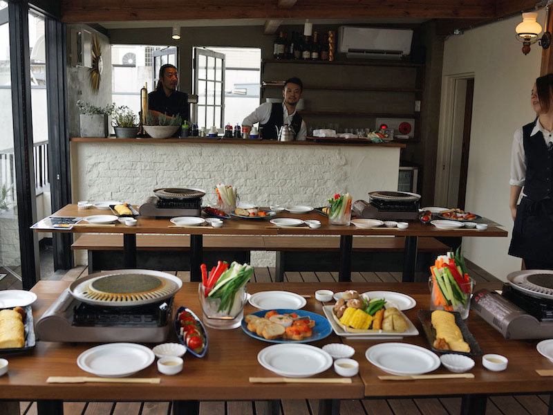 ガスコンロの上に丸い石版。脂や油が垂れて溢れるようにこんもり盛り上がってて縁に穴が開いている。下には水がはられてて、だから煙があんまり出ない。