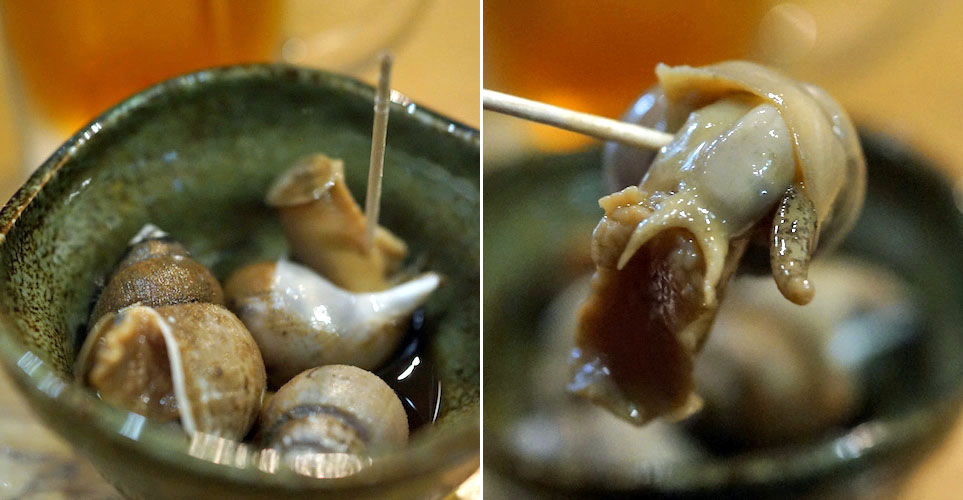 お通しが巻き貝、と書かれていたので何かと思えばバイ貝ですね! 大好物です。父方の祖父母が魚津に住んでいたもので、毎年夏休みはあたりまえのようにいただいてましたねぇ。東京でいただくようなごちそう感たっぷりのゲンコツサイズのものではなくて、玉ジャリみたいなものをゴロゴロと鍋一杯に食べるのが、子供の頃の楽しみでした。かまぼこといい、ちょっと特別な食文化ですよね。