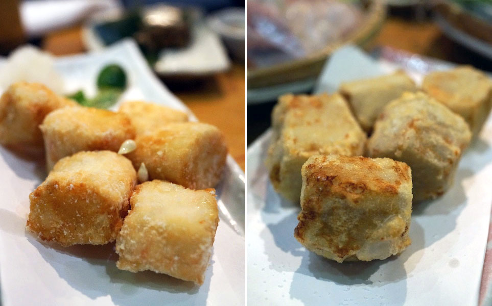 右側の写真は揚げた里芋でして、出汁をしっかり煮含ませたそれだけ食べても充分おいしい里芋に、薄い衣をまとわせサクッと揚げたもの。