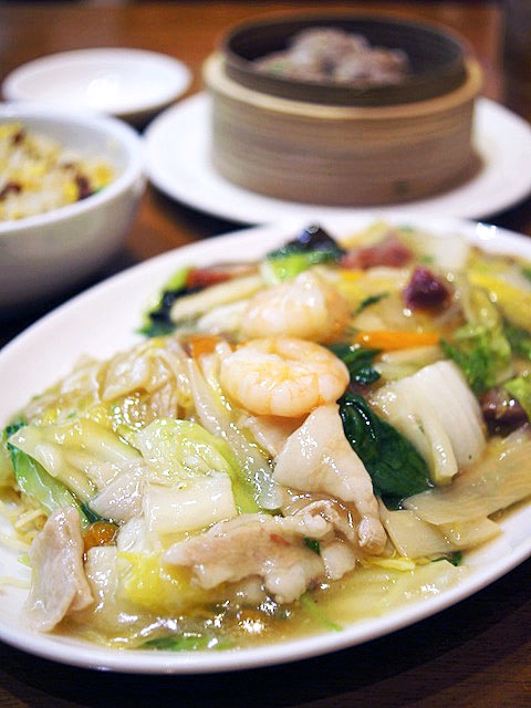 タップリあんがかかった五目で、豚肉にイカ、エビにチャーシュー、野菜があれこれ。