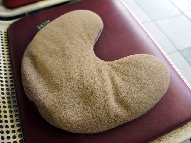 薄いフェルトの生地の中にそば殻が入った、首の回りに巻いて寝る用の小さな枕。