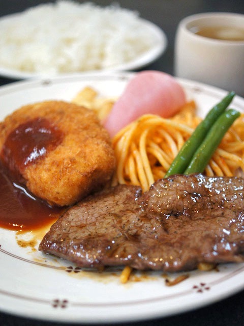 メニューに「ビフテキ」と力強いゴチック体で書かれててやっぱり関西に来たら「テキ」を食べなきゃと、結局Aのセットを選んでたのむコトにした。