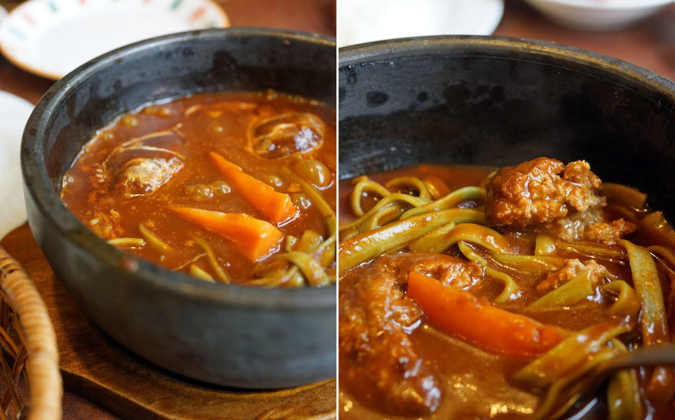 ホロリと肉がほどけて壊れ、コッテリ味のデミソースと一緒に口の中にあるのにしっかり肉の味わいがある…、食感ドッシリ、肉を食べてるって感じがするのがオゴチソウ。