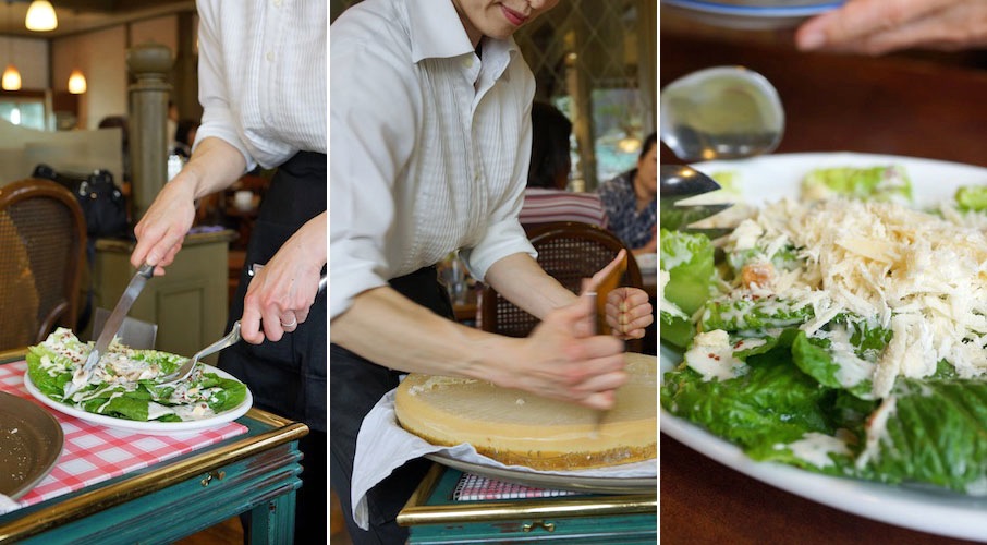 グラナパダーノチーズの大きな塊を、ステンレスのスクレーパーでユックリやさしく力をいれて削ったモノをタップリ、サラダベースの上に飾って出来上がりという。