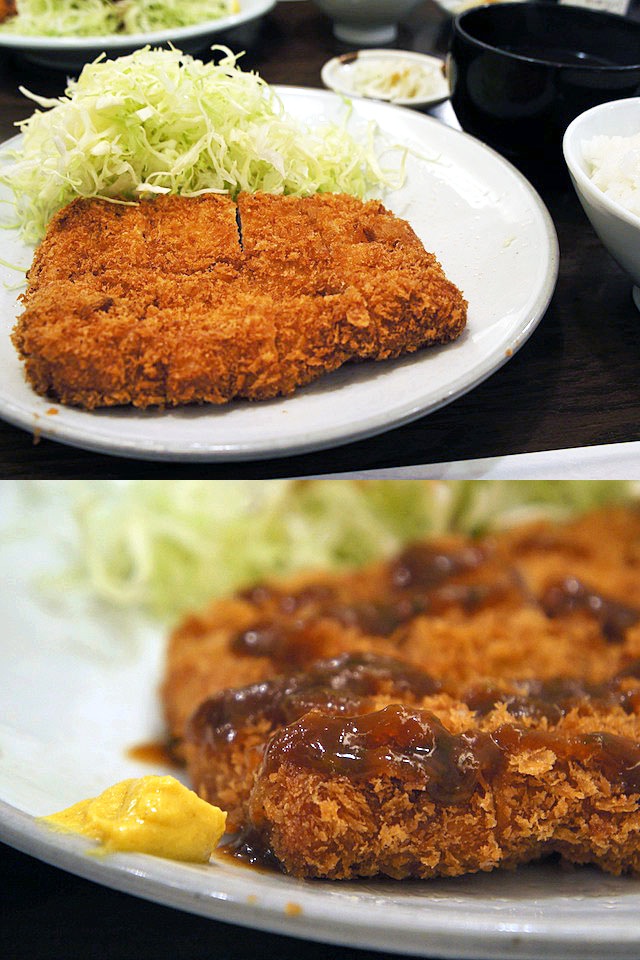 ヒレとんかつには甘めのカレーを置くようにのせ、キャベツに辛めのソースをかける。