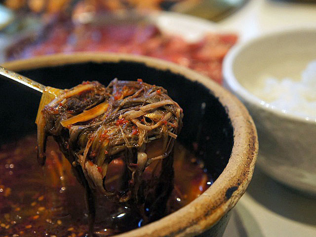 スプーンで軽く中身をすくって持ち上げたなら、なんとこれだけタップリの牛肉の筋がのっかってくる。
