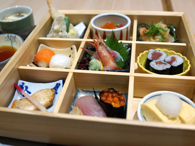 甘エビや白身の刺身が真ん中にあり、上下に握りや軍艦、巻物、バラ寿司、一口大のてまり寿司。四隅に料理が詰め込まれ、目ににぎやかな、まさに「にぎわいのある寿司弁当」ではある。なのに見せ場がないから、なにから食べていいのか迷う。