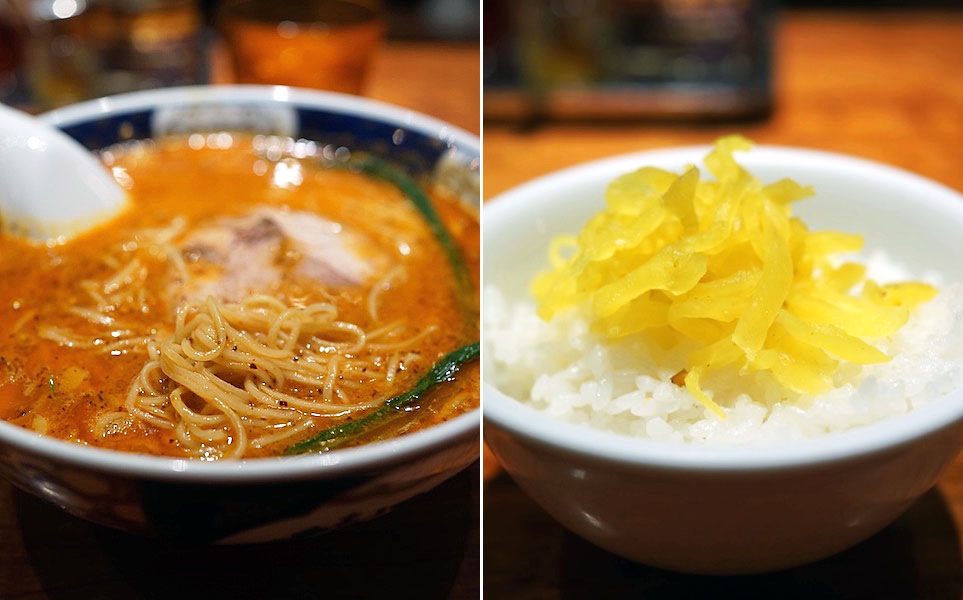 ご飯の上にタクワンのっけてパリパリ食べつつ麺を待ち、麺がやってきたらばそれをズルズル…、極細麺がザクザク前歯で歯切れて口でバッサリちらかる。