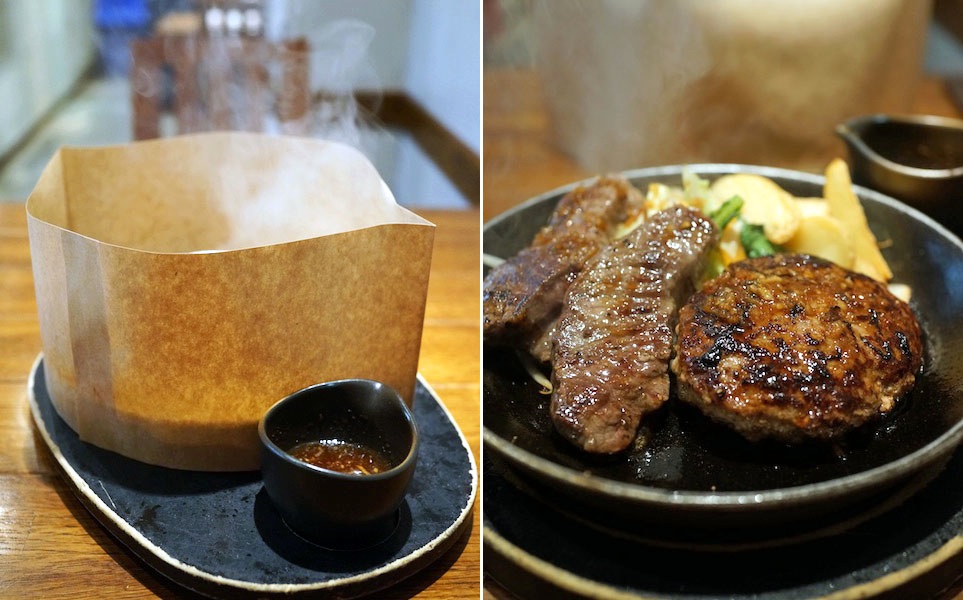 特製の木の板の上に丸い鉄板、そしてタレが入った小鉢が肩寄せ合ってやってくる。