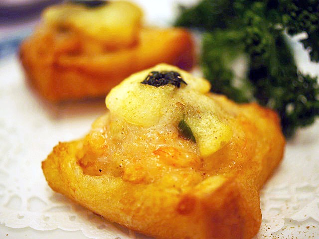 エビのすり身を食パンにぬり、油で揚げたエビのトースト。