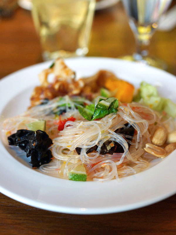 春雨サラダに根菜を蒸しどりと一緒にピリ辛味で和えたもの。そこにピーナツやフライドオニオン、刻んだライムを薬味で散らしてパクリと食べる。酸味と辛味が気持よく、甘み控え目。食欲スキッと湧いてくる。