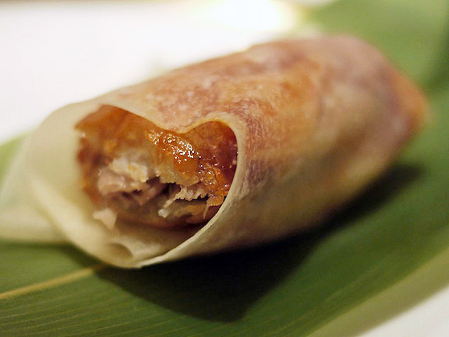 皮を幾層にも重ねてそこに、ナッツや干した豚肉、それに香草はさみ中華クレープで包んで食べる。