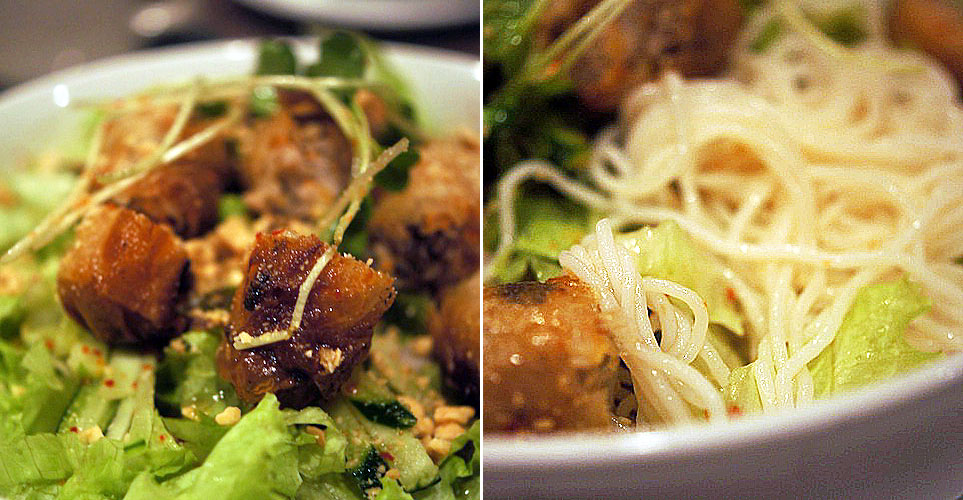米粉で作ったベトナム風の素麺を茹でて冷まして、それをスイートチリとチキンスープで味をととのえどっさりレタス、揚げ立て熱々の春巻きをのせてザクッと味わう。