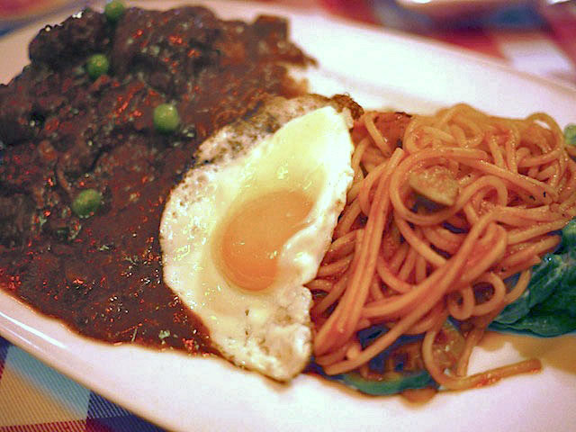 良く煮込まれた牛肉が、まるでコーンビーフのようにほろほろほぐれて混ざったソース。