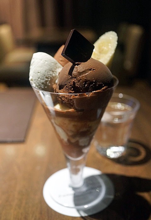 ススッとうつくしいグラスの中に、バニラアイスクリームにチョコアイス。