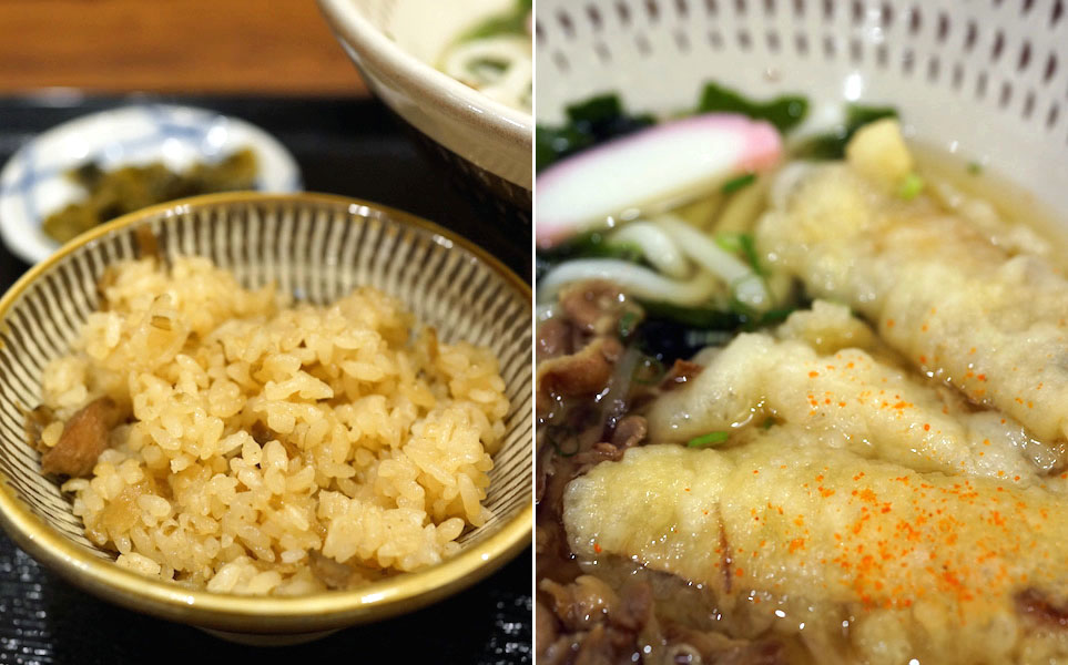生姜の風味がおいしい牛肉の甘辛煮。カリサク、固く揚がったゴボウの天ぷらもすぐに食べずに、出汁に沈めてしばらく待って、衣がブニブニ、汁を吸い込み膨れたところを食べるとなんとも言えぬおいしさ。
