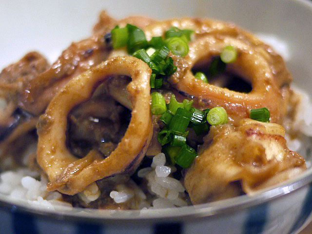 フライパンでみりんと味噌と、それからイカのワタを使って軽く炒めてそれをご飯にのっける。