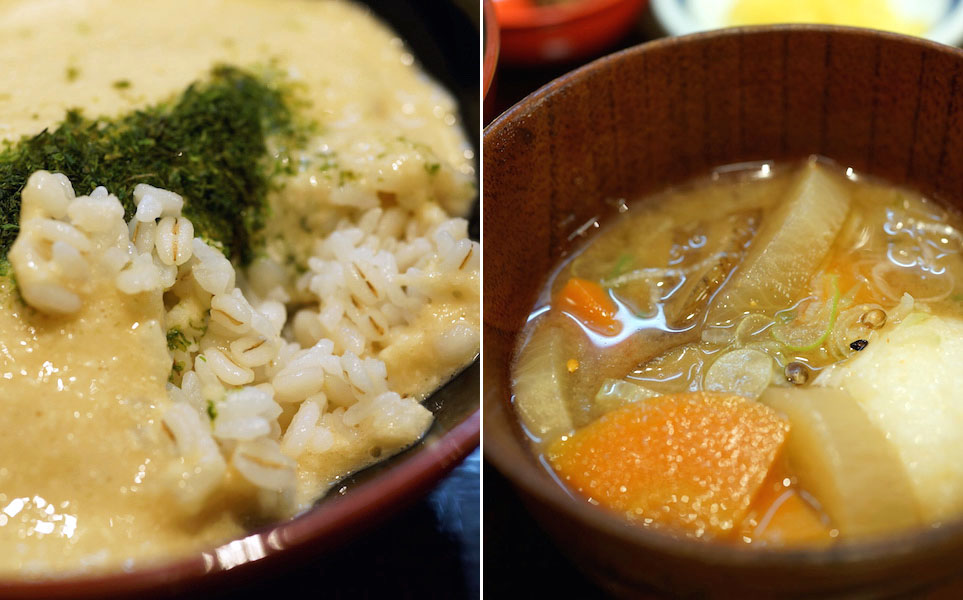 ホツホツとした固めに炊けた麦飯に、モッタリとしたとろろのトロミがしがみつきそれらが互いに離れるようで離れずずっと口の中に居てくれる。
