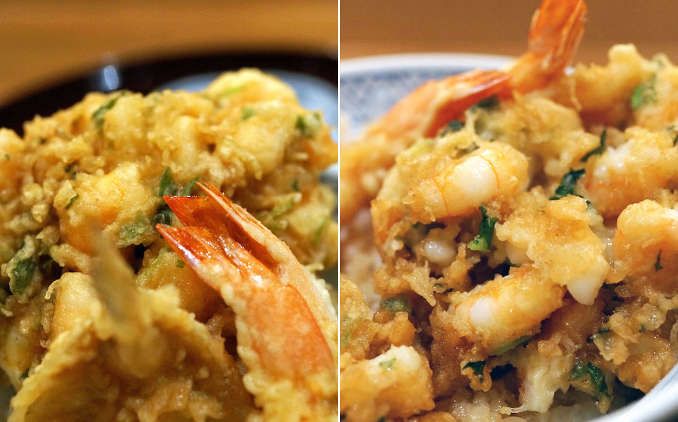 かき揚げの中にもゴロゴロ、小さなエビが入ってる。天ぷら衣に包まれてそれがムチュンムチュンと歯切れ続けるたのしい食感。