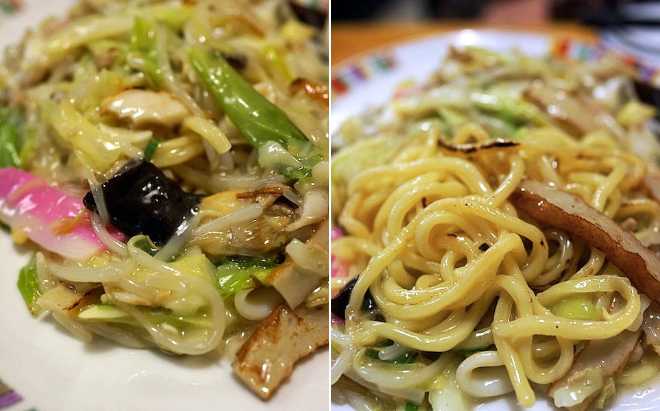 太い麺を蒸して鍋で焼き上げ、そこに具材タップリのあんをテレンとかけたべる…、東京では揚げた細麺が一般的でけれどボクは太麺の方が好きだったりする。