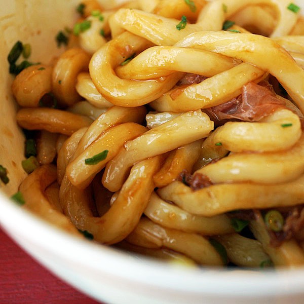 包丁で切り目を入れて、そこがブリンとはじけるようにめくれて仕上がる…、皮も一緒にバリバリ食べる。