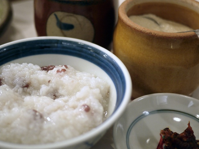 ここの名物、小豆のお粥にざらめをたっぷりふりかけ食べる。