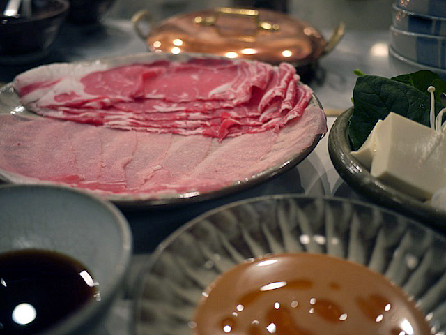 豚は肉の端をつまんでヒラヒラ泳がし火を通す。