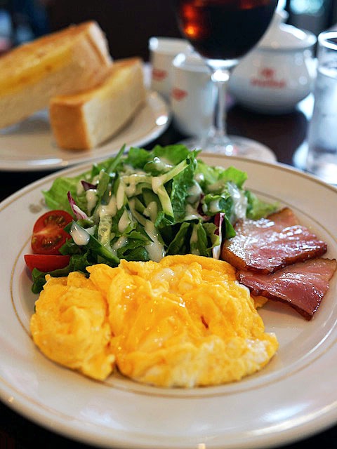 トロンとなめらかに仕上がったスクランブルエッグにサラダ、厚切りベーコンをグリルしたのが盛り合わされてる。