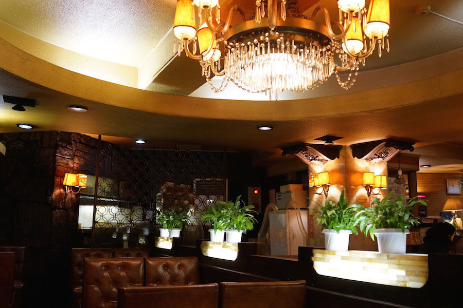 大きなシャンデリアがキラキラ、上からぶら下がり、人工大理石のテーブル、人工皮革の張地のソファと、どれもがまさに昭和的。