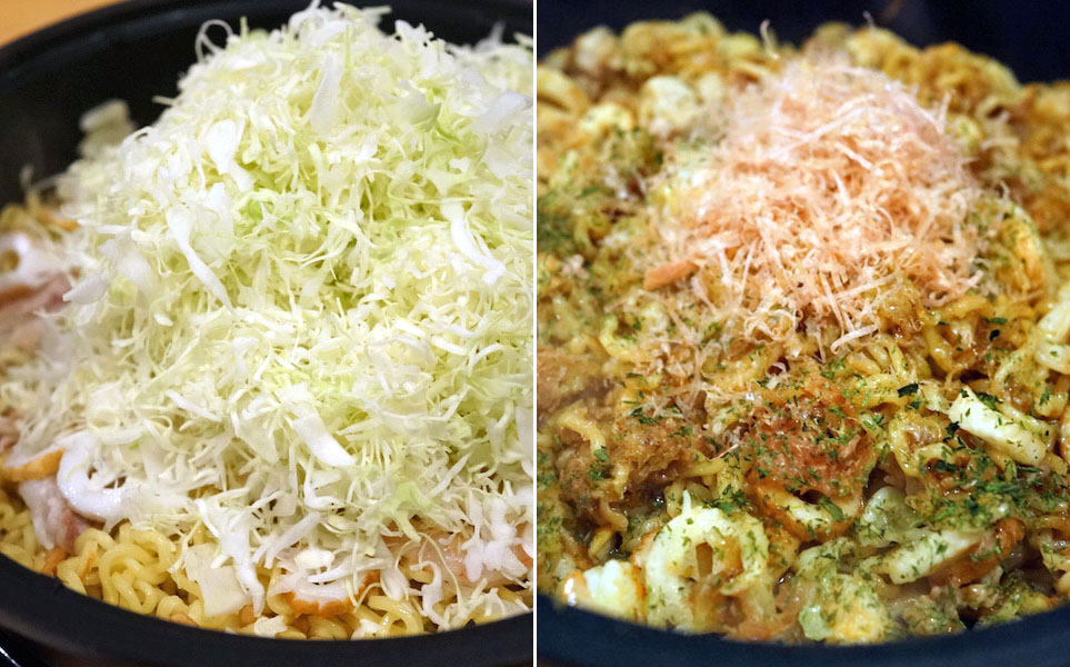 塩と胡椒をほどこしたらば蓋して蒸し焼き。蓋をあけたらビックリするほどかさが減ってて、千切りキャベツの甘みが麺に移って旨い。