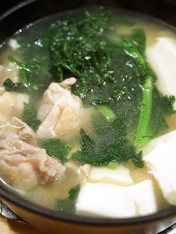 鶏のもも肉をぶつ切りにして、熱湯かけて軽く洗って昆布を浸した鍋でクツクツ。日本酒加えて沸騰させて、アクをひいたらあとは弱火でコトコト煮こむ。鶏の脂がキラキラしてきて、そしてらそこに豆腐を入れて最後に春菊。