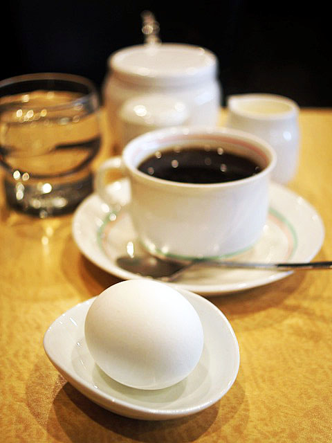 でも、日本橋の紳士たちは何食わぬ顔で殻を割り、塩をタップリかけ回しつつ新聞片手に玉子を味わい、酸っぱいコーヒーをゴクリと飲む。