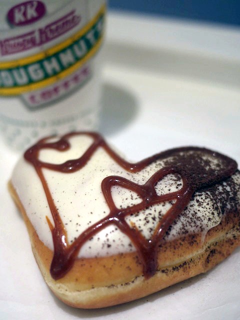 ハート型のドーナツをホワイトチョコでコーティングして、キャラメルでハートを描く。