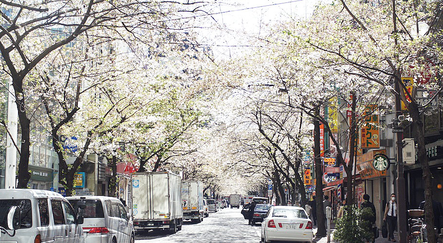 桜の木が大きくはない一車線の道路の両側にズラッとギッシリならんでる。