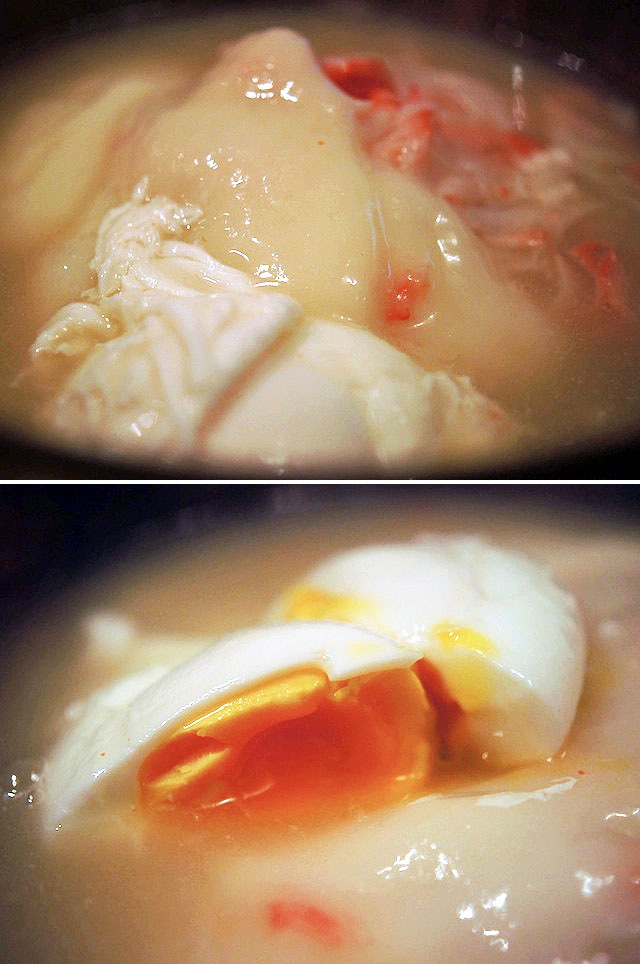 とろりとお餅が喉をなで、玉子を割ると、なんとシアワセ…、黄身がようよう固まる程度の熱の入り方、オキニイリ。