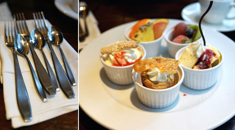 もしお腹に余裕があるようでしたら、デザートを見繕って持ってきましょう…、とお願いするとホワイトチョコレートのムースにシナモン味のスポンジケーキ、チーズスフレにフルーツあれこれ。