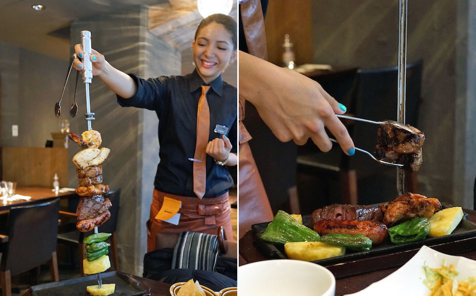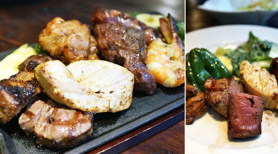 熱した鉄板に串から外して、あとはお好きに…、というやり方で、うれしいコトに今日は三名。用意されてる牛肉、豚肉、チキンにチョリソ、エビにカジキマグロを全部もらってシェアをする。