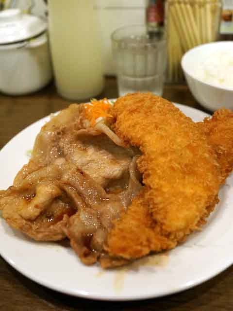 ただ、今日はちょっと変わったものを食べてみたくて、まずは生姜焼きを選んでそれにササミのフライをのっけてもらう。