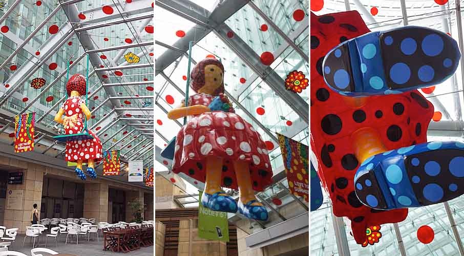タワーの下の大屋根広場にはブランコに乗る水玉姿の女性の人形。