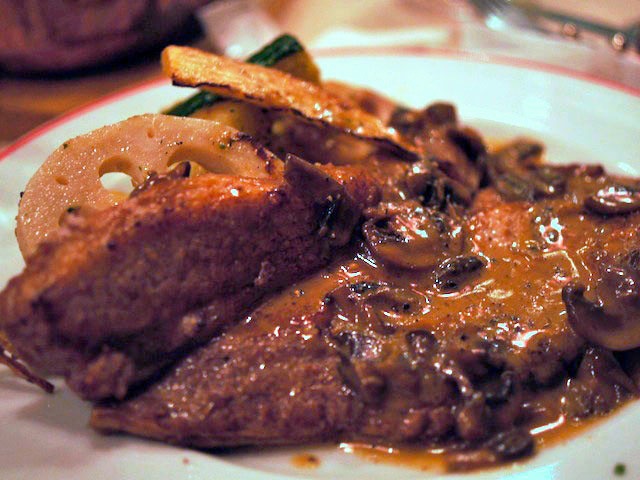 骨付き豚をローストし、脂でツヤツヤしたとこにローズマリーの香りをつけた、サクッと歯切れる食感たのしむ男性的なる一品や、仔牛の肉をきのことソースとグリルしたもの。