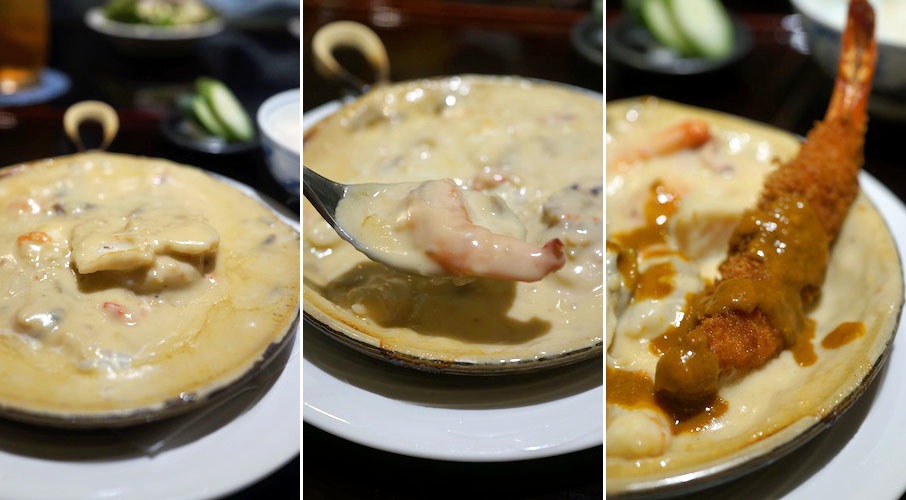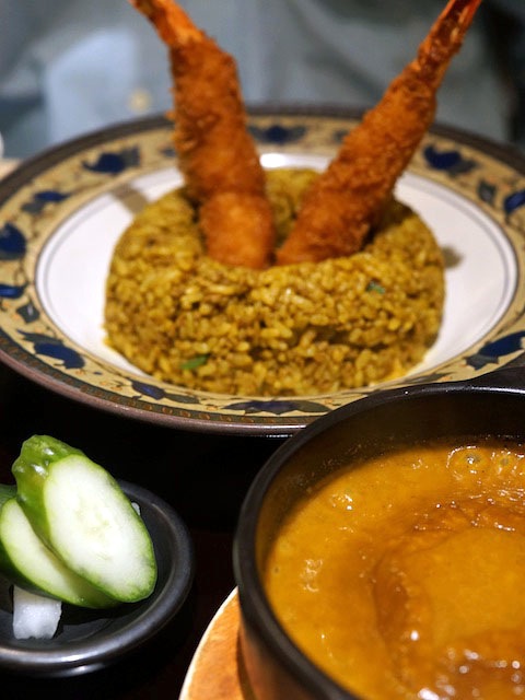 エビフライをシチューに浸し、カレーと一緒に口にふくむとこれまた旨い…、そもそもフライのパン粉がカサッと香ばしく、エビもムチュンと上等なエビ、素材それぞれが自分がすべき仕事をキチンとこなしてる。