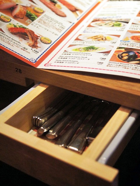 そのテーブルのテーブルトップの下に引き出しが造られていて、そこにズラリとナイフにフォークにスプーンが並ぶ、お店のスタッフを呼ばずとも良いたのしい工夫。