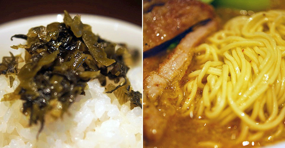 ご飯がサービスでつくのもうれしく、テーブルの上に置かれた高菜の漬物をご飯にのっけてスープと一緒にザブザブ食べる…、お腹いっぱい、オゴチソウ。